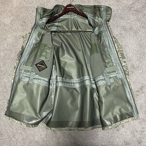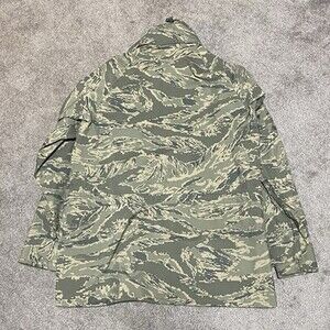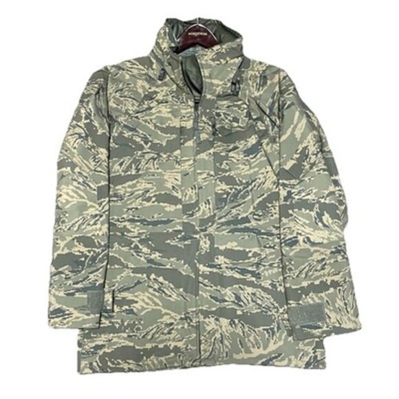 US Military ECWCS Gore-Tex Parka - Small Short Genuine USGI Extended Cold Weather Clothing System (ECWCS) Level 6 Gore-Tex parka in rare USAF APECS tiger stripe digital camouflage pattern. 100% waterproof breathable shell with seam-sealed construction, adjustable hood, multiple cargo pockets, pit zippers, and full-length storm flap. Brand new condition with original tags, US Army certified (USFDA 88-10-006), never worn or washed - rated for extreme cold/wet conditions down to -45°F. • Brand: Valley Apparel LLC (USGI Contractor) / Gore-Tex • Size: Small Short (Chest 36-40", Height 63-67") • Measurements: Pit-to-pit 24", shoulders 20", length 28" back, sleeves 23" • Color: USAF APECS Tiger Stripe Camouflage (digital tiger pattern) • Style: Level 6 ECWCS parka, zip-out hood, adjustable cuffs/waist/drawcords • Material: Gore-Tex waterproof breathable shell w/ nylon liner • Features: USFDA certified, bellowed cargo pockets, pit zippers, hook/loop closures • Origin: Made in USA Authentic mil