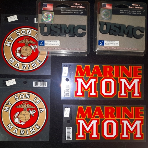United States Marine Core Proud Mom Bundle. Includes 2 Chrome USMC logos, 2 My Son IS A Marine stickers and 2 Marine Mom stickers. All brand new and never used.