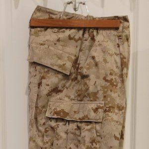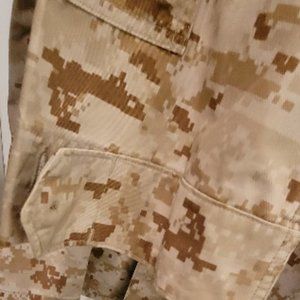 Excellent condition used USMC surplus Desert MARPAT camo field trousers and BDU shirt. Pants have one tiny wear hole on upper right thigh (see photo), otherwise both items are flawless. Pants will fit mens waist 27-31, the inseam has been tailored at 33inches. There are no waist adjust pulltabs. The bdu shirt is perfect. Nonsmoking environment.