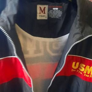 Vtg 90's USMC The Few The Proud Black & Red Mesh lined embroidered zip front pocket windsuit Jacket. Embroidered USMC on Back. USMC The Few The Proud on front. Elastic Bottom hem. Hook Loop straps on sleeves. Preowned looks like it has never been worn. See all pictures as part of description. All items have been laundered, drycleaned, steamed and/orpressed. Shell 100% Nylon Lining 100% Polyester.