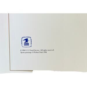 This is a wonderful gift for the sports enthusiast and/or stamp collector & is a coffee table book. It is beautifully illustrated with paintings and 1984 Olympic postage designs by Robert Peak. This hardcover book has a navy blue cloth cover with gold text & illustration of Olympic runner carrying the Olympic torch. The spine holds gold text. It has glossy gold front papers. Overall it is in new condition & has never been opened. All pages are intact, attached, and & tight.