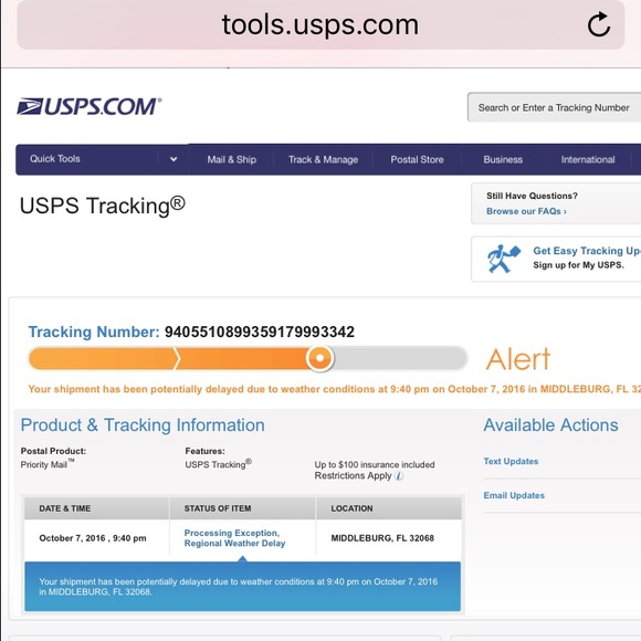 I just got an email with this info I'm not quite sure what's going on with the shipping idk why I received mail just fine after hurricane Matthew but sending out mail is having so many issues but here I can see it is shipped it just is at the post office due to delays but will be sent out soon I am very very sorry idk whts going on with the mail??