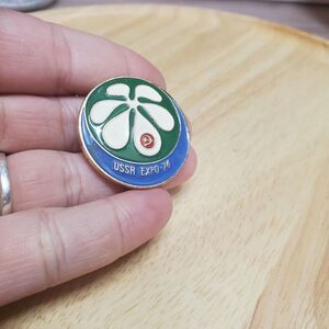 This vintage lapel pin is a unique piece from the USSR EXPO 74 in 1974. Made of gold tone metal and enamel, it features intricate details that make it a great addition to any collection. Its theme is Carnivals & Fairs, and it was manufactured in an unknown country/region. This pinback is a rare find for collectors of pinbacks and makes a great conversation starter.