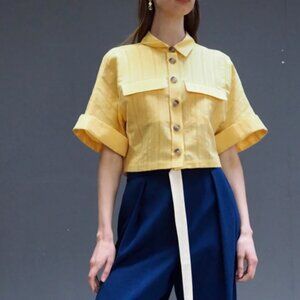 designed to a cropped, boxy fit with a neat collar. It has a button-through placket, functioning flap pockets, and a deep box pleat at the back. There's a subtle transparency to this shirt, made from a premium cotton linen blend. Designed in bright sunflower yellow.