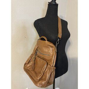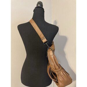 Super cute backstyle type purse in a warm brown faux leather fabric that is buttery soft. Black lining. Has two pockets with zippers on one side. Two pockets on the sides. 3 zippers inside the bag with pockets.