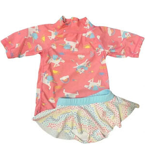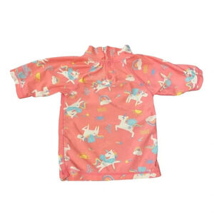 EXCELLENT USED CONDITION - No stains or holes. Adorable two piece unicorn bathing suit with UV 50 + protection. Skirt bottom with long sleeves tops. Snaps up the back.