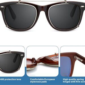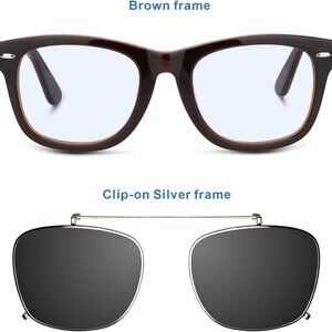 Features: Lightweight and trendy, these clip-on sunglasses combine polarized lenses to cut down glare, making them perfect for driving, outdoor adventures, or everyday use. The vintage square shape adds a timeless vibe, while the acetate frame with a gold metal rim gives it a chic, durable feel. Easy to clip on and off, so you can adapt to changing sunlight without hassle.