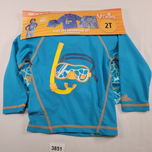 UVSkinz Kids 3 Pc Swimwear Set RashGuard Shorts Reversible Hat Size 2T Fish Vacation