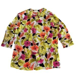 Beautiful UbU floral blouse in a vibrant mix of pink, orange, green, and black. Features UbU signature crinkle-textured travel fabric - lightweight, wrinkle-resistant, and easy to pack. The colorful floral pattern gives off a fun Y2K/early 2000s vibe.