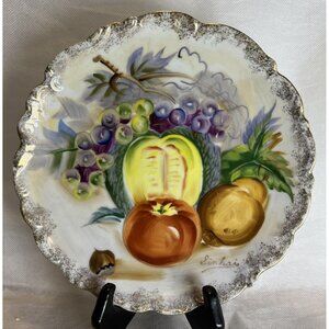 Ucagco Japan Fruit Plate Signed by Sinkai, Hand Painted, Gold Rim, Vintage 1960s