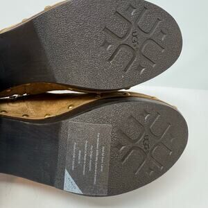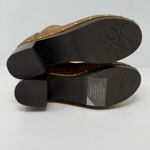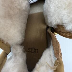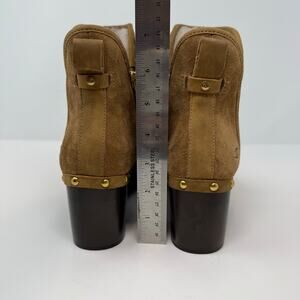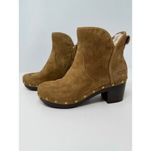 Ugg Women's Booties. In the color chestnut brown. Tagged size 8. These women's Ugg Cam II ankle boots feature a medium brown suede upper, gold tone studded accent, 2" block heel on a full platform, stamped logo, soft sherpa lining, almond toe and heel pulls. Style number 1013599. In excellent preowned condition with minimal signs of wear - EUC.