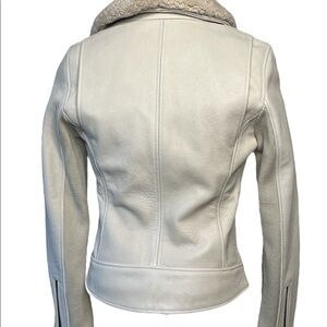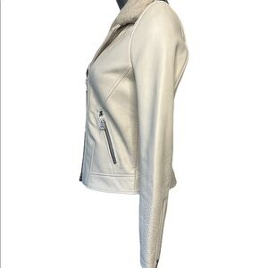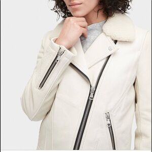 Buttery soft leather and a removable sheepskin collar elevate the timeless moto jacket.The perfect piece to top off every outfit,features ribbed detailing & asymmetrical zip pockets.