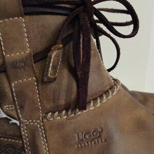 Ugg Australia Cove Brown Leather Sheep Skin Lined Wrap Around Lace Up Ankle Boots in Size 8. The color of the leather is a little uneven in places due to waterproofing, but otherwise, they are in great condition.
