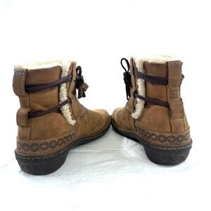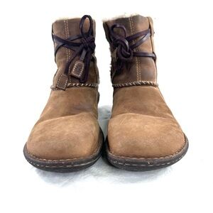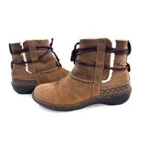 Are you looking for a winter boot that has lots of style? This Ugg Australia Cove La Jolla women's size 9 toast brown suede winter snow ankle boot 5136 is lined with sheepskin shearling for extra warmth. It slides on and off and has stylish lacing. Sole is slip resistant.