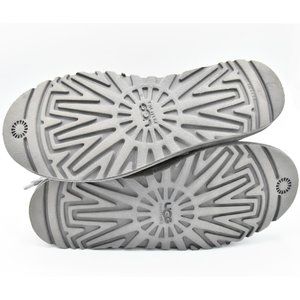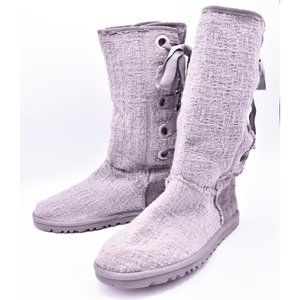 Gorgeous pewter gray chunky knit genuine Ugg Heirloom boots. Lace up back with grosgrain ribbon and grommets is adjustable. Suede heel. Unlined shaft. Shearling footbed.