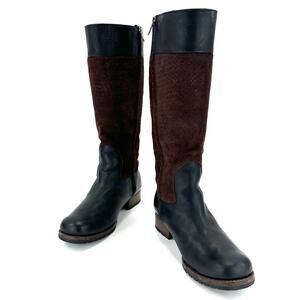 Ugg Australia Knee High Winter Boots Size 11 Black Leather Brown Embossed Suede Genuine Sheepskin/Wool/Shearling Lining Stacked Block Heel Cold Weather Tall Boots.