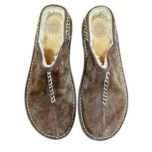 Ugg Australia Kohala taupe brown suede & sheepskin slip on clogs/slippers. Rubber soles. Round toe. Welt stitching. Embroidery detail on heel. Euc