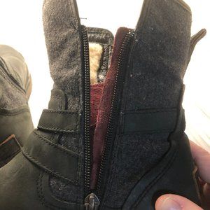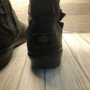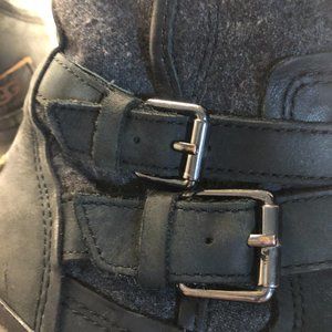 Ugg Australia Waterproof Ankle Booties. Leather lowers, and wool like upper. Size 9 . Black in color, sherpa lining. buckled strap around ankle rounded toe.. fun steampunk style. Good for inclement weather, or motorcycle riding. Good Used Condition. No tears or stains.