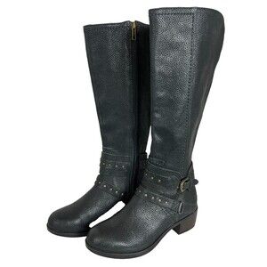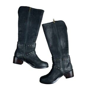 These Ugg Australia Women Black Leather Riding Style Fashion Boots are a stylish and versatile addition to any wardrobe. With an almond toe shape and low block heel, these knee-high boots feature studded accents and a belted detail for added flair. Made from pebble leather with a fabric lining, these boots are perfect for various occasions including travel, parties, casual outings, and workwear. The rubber outsole provides durability and comfort, making them a practical and fashionable choice for the winter, fall, and spring seasons.