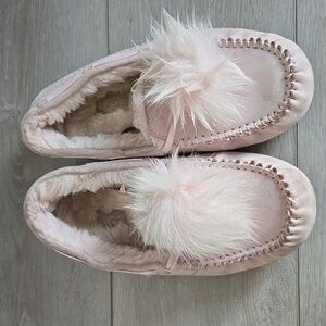 Cozy pink moccasin slippers with fuzzy pom-poms. Perfect for lounging.