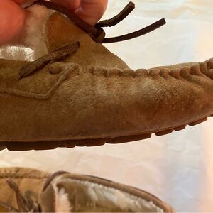 Ugg Australia Women’s Dakota Moccasin Slipper, size 6, Lined with Uggpure Wool, Suede Upper, Embossed logo on side, Rubber Sole. In Good Pre-Owned Condition, Has some wear and spots as noted in the pictures. This is one owner, personal shoes. Still has a lot of wear left.