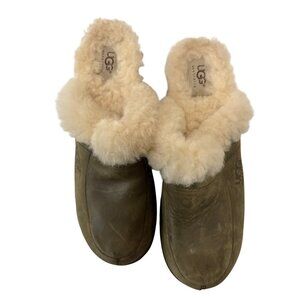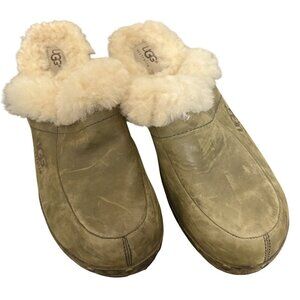 Ugg Australia Womens Size 8 Shearling Clogs Olive Green Leather Fur Lined Slip-O