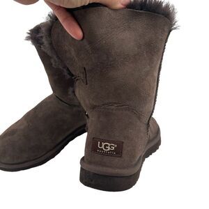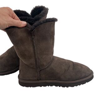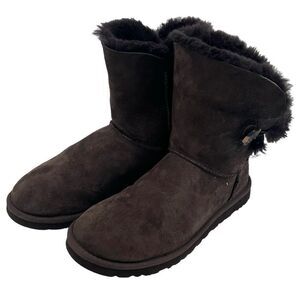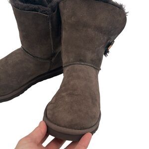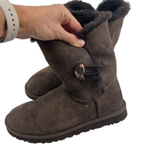 Ugg Bailey button chocolate brown size 9. Preowned condition. Damage to one button. It still functions but see photo for damage. Top of boot shaft can be folded to help disguise the broken button.