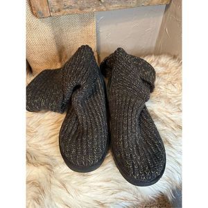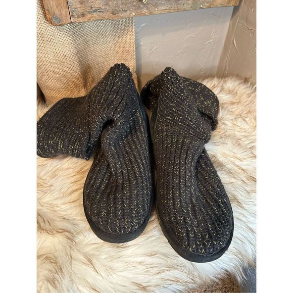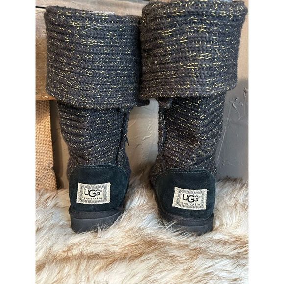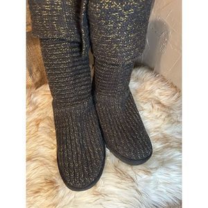 These Ugg boots are are black tweed with metallic thread sparkling throughout. Three large buttons adorn the sides. These can be worn folded down or straight. Folded, the boots measure about 11” tall. Unfolded, they are about 15”.