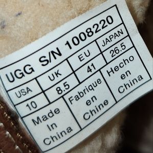 A chic buckled sheepskin collar helps these chestnut brown round-toe UGG boots make a stylish statement. Fashioned from water-resistant