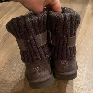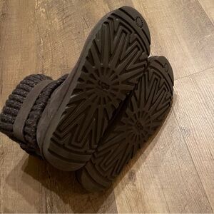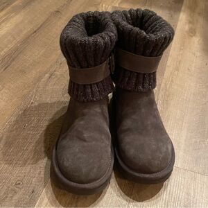 Ugg Cambridge boots in grey, size woman’s 7. Knit upper with suede lower. Foot suede section is lined with shearling for a warm and cozy feel. Removable suede leather buckle. Excellent condition; gently worn with minor dirtiness / wear it the tread. Suede and knit fabric are very clean.