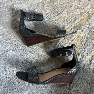 Black braided leather upper. Zip up closure on back of ankle, adjustable buckle on ankle strap. Mini wedge heels approx 2 inch heel