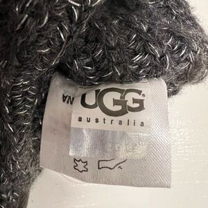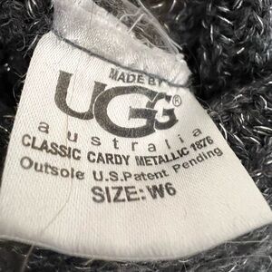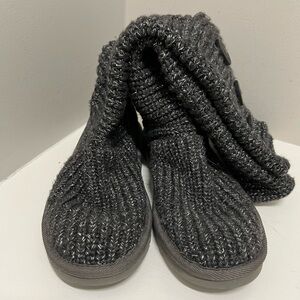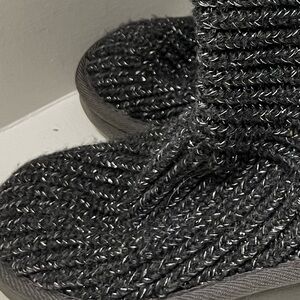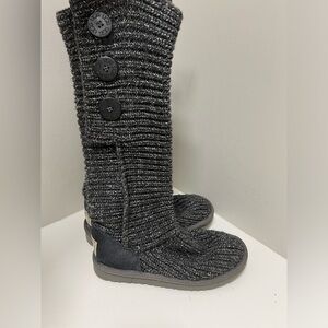 Ugg Classic Cardy Tall Sweater Boots. Color is gray with Metallic threading. Size is a woman’s 6. Hologram tag in left boot for authenticity. Good preowned condition with only a very small dark area discoloration on the right boot heel. Barely noticeable while wearing! See pictures for details