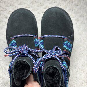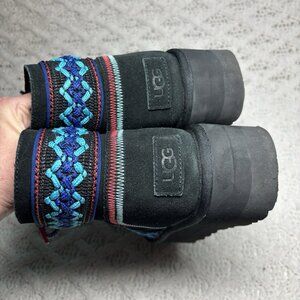 The product is a pair of Ugg Classic Mini II Braid Chestnut Platform Uggs in black, size 6, unisex. These slip-on boots have a round toe, mid-height platform heel, and ankle shaft style. They are made of suede with wool lining and insole, making them perfect for winter and fall seasons. The boots feature embroidered accents and come in a bohemian, celebrity, and outdoor-themed style, suitable for various occasions like travel, activewear, and casual outings. The Ugg Classic Mini II boots are a popular choice for those looking for a trendy and comfortable footwear option.
