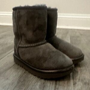 These cozy Ugg boots were worn for one season, and have some wear on the toes. The fur on the inside is in perfect condition, as well as the rest of the boot. They still have a lot of life. Size 8 in Toddler. True to size.