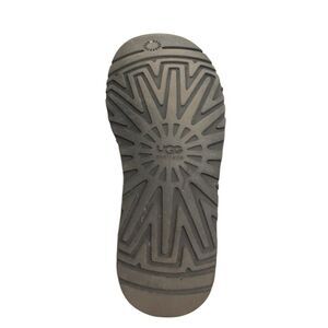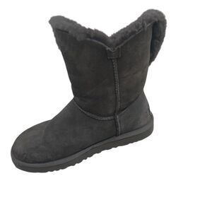 These are preowned gray short ankle boots by Ugg. They are a great suede material. They have no holes but do show some minor staining and creasing. Please see up close images for details. They are wool lined and have a one button detail.
