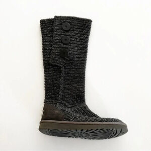 Ugg classic cardi boots in dark gray metallic sweater knit women’s size seven. Shearling lined at foot bed. Logo etched buttons. Can be worn up or down. Preowned, like new condition. These boots are fabulous!