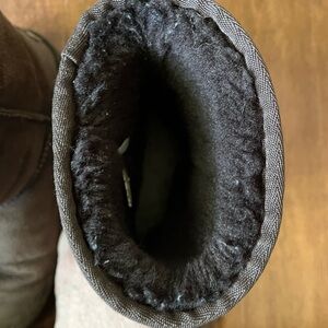 Luxurious Ugg dark brown suede boots with soft shearling lining. Ideal for chilly days.