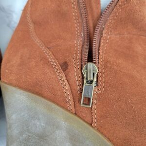 Pre Loved with some discoloration on rubber soles and outsoles, a few fuzzies on shepra, and a dark spot near the bottom of the zipper