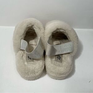 Gently worn women's size 7 Ugg Fluff Yeah Off White/ Cream colored Sherpa platform slippers. Silver glitter strap. Please review all photos for any signs of wear-pictured as is. Disclaimer: Any items with any wear/staining has not been treated, and unsure of ability to remove/treat condition. Comes from a smoke free home, bundle with other items to save & minimize shipping cost.