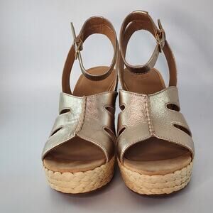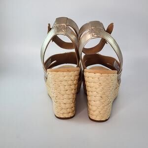 Gold metallic Careena wedge platform sandals from Ugg. Gold leather. Buckle ankle strap. There is a tiny mark on one shoe as shown in the photos. 4 1/2" heel includes 1 1/2" platform