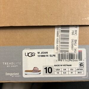 These UGG Joan Seashell pink platform wedge slides slippers size 10. These shoes have never been worn. These shoes are still in the box. Leather top. Supportive foam footbed and a lightweight outside for all day wear.