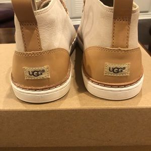 Two tone leather lace up high top sneakers. Mouton heel cushioning.. New in box. Sz 8