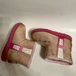 Iridescent Pink In good used condition. Shows light wear to the exterior. The inside fur lining is not as fluffy or plush as it was new, but still soft. These are grade school/big kid size 2, to fit an estimated