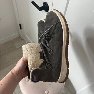 Ugg Lakesider Heritage Gray Waterproof Sneaker Booties Size 9.5. Gray leather material with white sherpa lining. Lace up sneaker style booties. Great for the winter/cold weather! Braided detailing on back. Traction on sole. 5.5” tall.