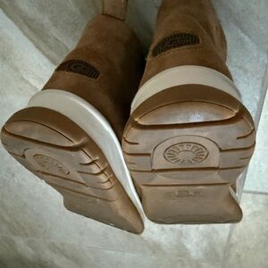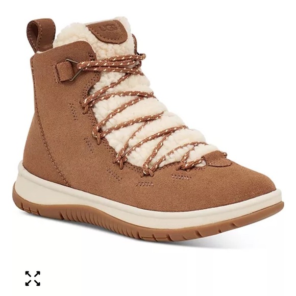 Cozy UGG suede ankle height booties with plush Sherpa lining. Durable sole for winter wear. Stylish lace-up design.
