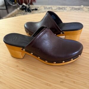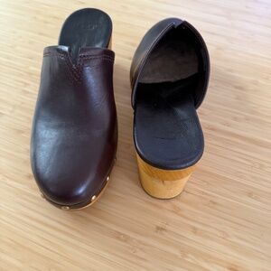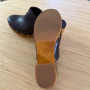 Size 9, with part shearling foot bed, sturdy wood 3" platform heel, studded detailing. Very gently worn, excellent condition.