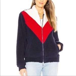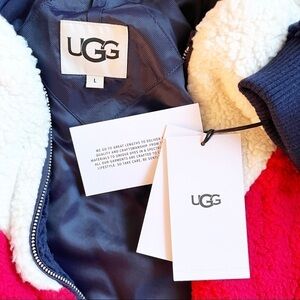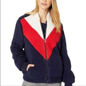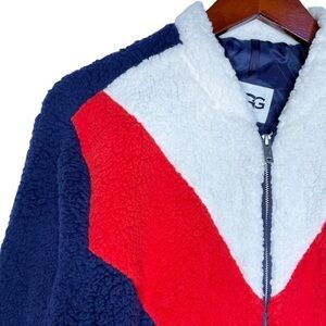 Brand New, Beautiful Annalise Teddy Jacket from UGG. This Jacket features a fun retro design with a very soft, plush Teddy faux fur style. Chevron pattern on front in Navy Blue, Red and White. Full front zip up style. Front slant pockets are fleece lined. Shell and lining are 100% Polyester. UGG is know for their quality, warm, cozy clothing Woman’s Size Large