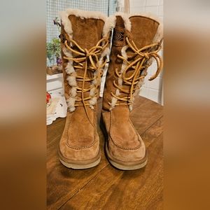 EUC all leather Size 10 Ugg Shearling Lined boots. "Appalachian" style with moccasin style boot. Rubber sole. Generous calf circumference.