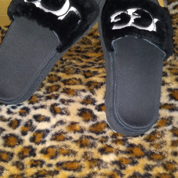 size 8 ugg Slides black with white embroidered lettering. not my size, worn once. they come with the box