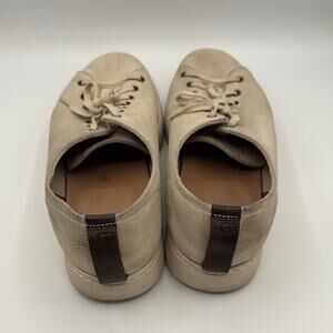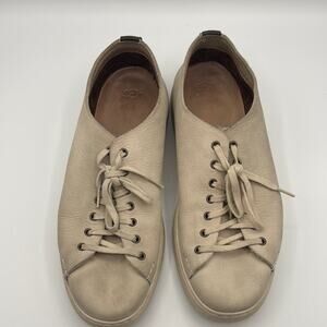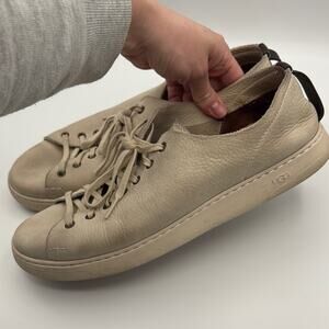 Used Ugg Leather Sneakers. These are a men's 11.5 Listed as used due to a darker scuff on one back ankle. See pics. It lightened with a wet rag, but I haven't done anything else to it. Could come out, could not. These are a grey / tan color upper with a slightly whiter lower sole. Ugg text logo on the sole. Lace up. Cool casual sneakers!
